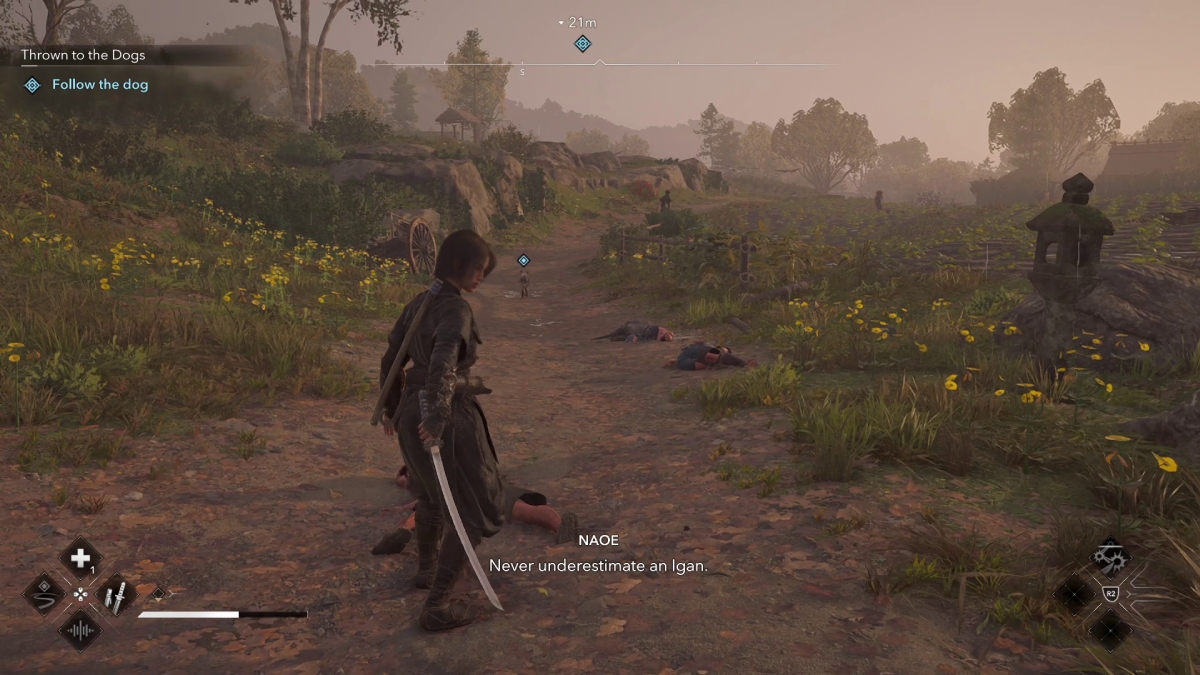 After killing an enemy and standing still, you can hold the sheathe button (usually the right D-Pad button on the controller), and Yasuke and Naoe will sheathe their weapons with a unique animation and some dialogues. Both will wipe off the blood from their blades and throw in a few “post-battle” dialogs. Frankly, it is just great to have the option to holster weapons on command instead of having the game do all of that automatically.
