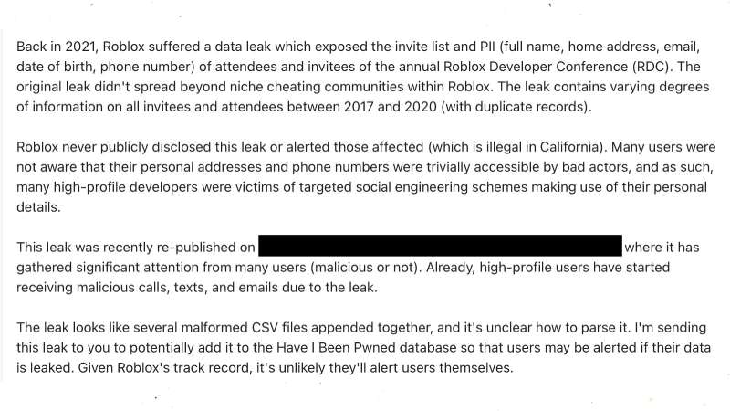 Details of the Roblox leak were initially broken by Troy Hunt, the owner of the “Have I Been Pwned” website which mainly focuses on data breaches. He got contacted by multiple sources that gave corroborating information. This confirmed that the breach took place in 2021, but it didn’t become too much of a problem at the time. Even so, some high-profile attendees started getting harrassed soon after.