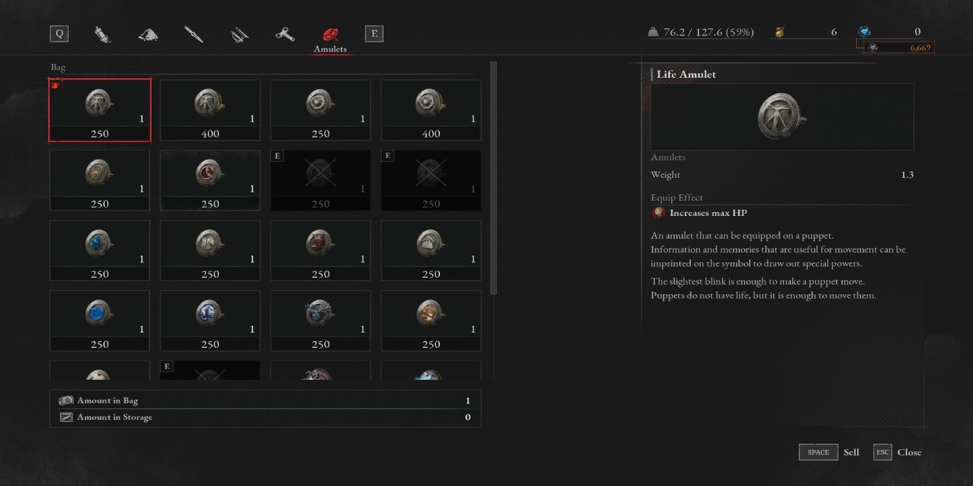 Amulets are some of the best items you’ll find in the game. Some provide you with more health, while others increase your damage to certain foes. Given the variety in terms of effects, we recommend always keeping them with you. If you upgrade certain areas of your P-Organ, you’ll be able to equip more than two, letting you create a stronger build for Pinocchio. So, even if selling them seems tempting, don’t do it, as you’ll need most of them for most encounters.