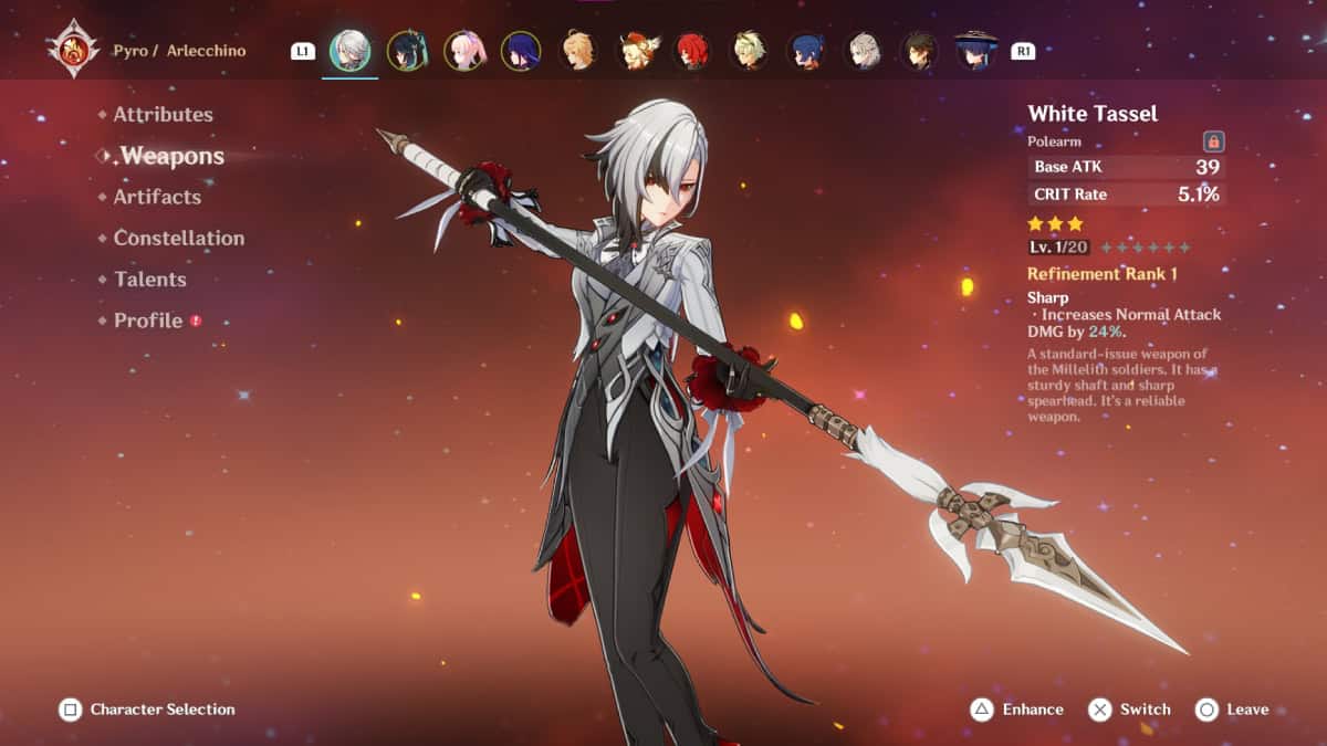 Undoubtedly, signature weapons usually have the best stats for your character. However, although we love the look of Crimson Moon’s Semblance with its owner, the truth is that you don’t need it. The difference between other polearms is not much, but you will be surprised to know that White Tassel is one of the best options if you don’t have Crimson Moon’s Semblance. Besides, White Tassel is a 3-star weapon, and you can find it in Liyue’s chests, so you can quickly get its R5. Arlecchino only loses 30% of attack damage using this Liyue’s polearm, which is quite generous.