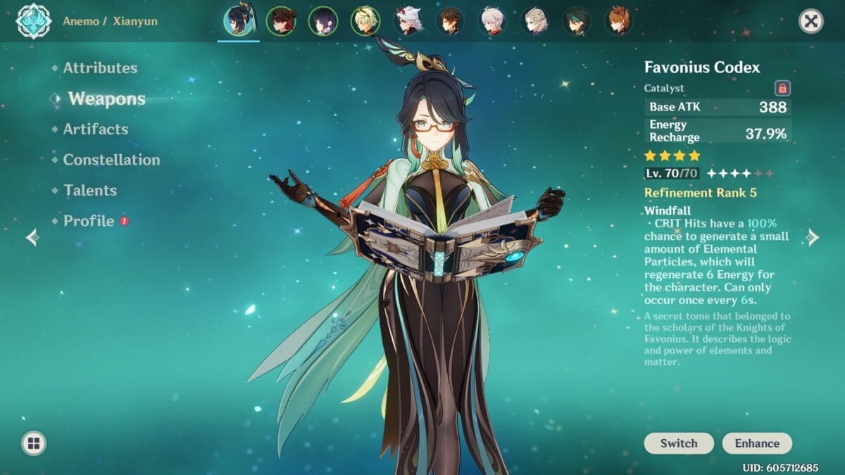 Xianyun’s Elemental Burst is rather expensive to use, and no Elemental Burst means no leaping into the air and crashing down on your enemies. To make sure that you can consistently fire off Xianyun’s Elemental Burst, you need to be sure to have plenty of Energy Recharge in her stats. One of the best weapons to use is the Favonius Codex, but you can also use her signature weapon, the Crane’s Echoing Call, which provides some extra energy particles.