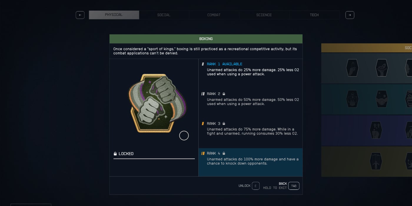 Though combat in Starfield suffers from the occasional bullet sponge enemy, it’s some of the most fun and satisfying in any Bethesda game. It also occurs a lot, so combat skills tend to be some of the most valuable in the game. So why is Boxing one of the worst skills in Starfield? In short, it buffs an ability that most players will never use. When you have guns, explosives, and even swords, there’s no reason to resort to punches, even when they’re upgraded. The only reason to spec into Boxing is if you intend to pick up Martial Arts later. Unless you have nowhere else to sink your points, leave Boxing be.