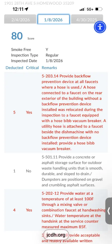 Public records show Demetri’s BBQ received a score of 80 on a January 8, 2026 inspection, a result that falls short of top marks and includes multiple critical violations. Among the most notable issues cited was the absence of backflow prevention devices on certain faucets, a requirement designed to protect water supplies from contamination.
