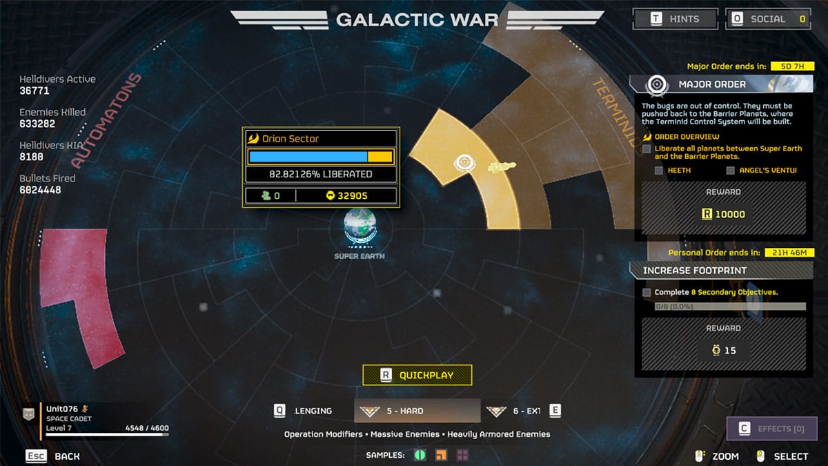 However, take note that higher difficulty levels don’t increase Helldivers 2 enemies’ health and damage. Instead, they increased the amount and changed the enemy types you’re facing. When accessing the War Table, press Q and E keys on the keyboard or L1 and R1 on a controller to change the difficulty levels. You can see what difficulty you’re in by looking below the Quickplay button.