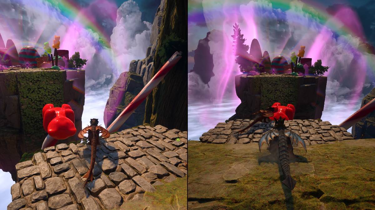 Open your eyes wide after getting the four dragon spirits from the temple and the cinematic, where you fly over the dragon spirit during the Treasure Temple mission. You will reach an area with pink crystals, and you can’t miss the location of this last one of the Side Stories because it has a huge pink aura and is surrounded by candy.