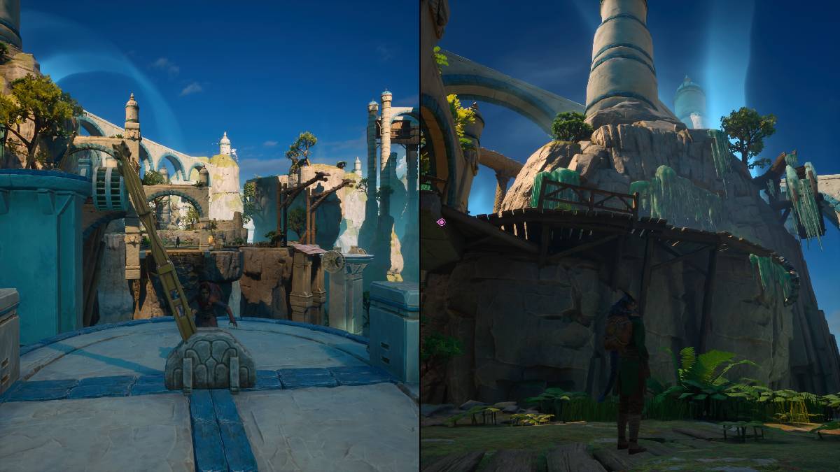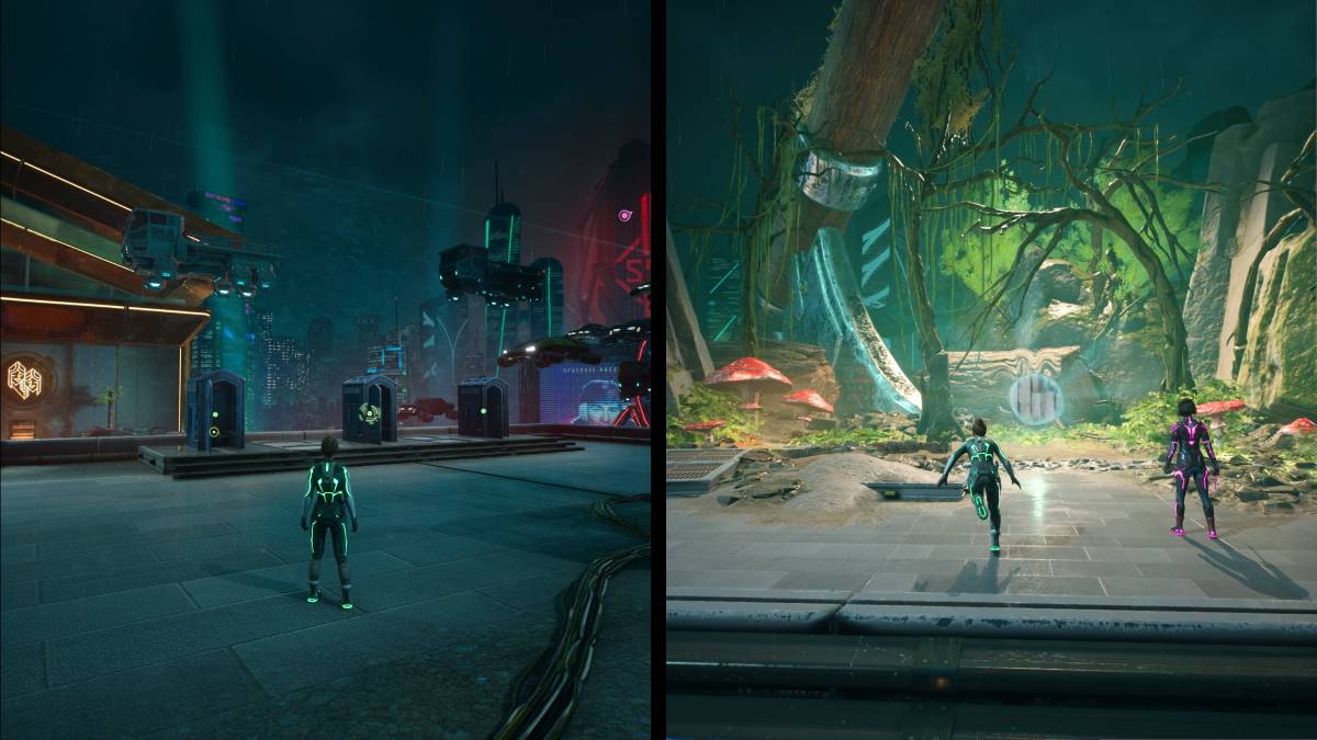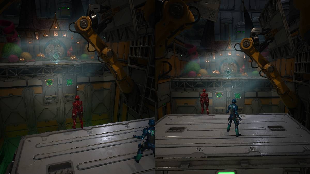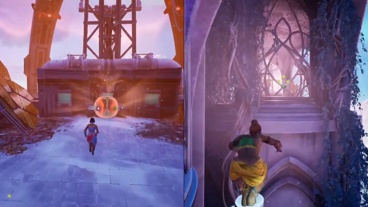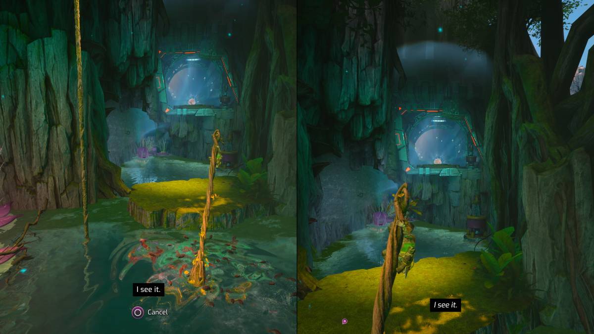 While Zoey fuses with the environment and can control the giant trunk, Mio must fight the monkeys in the Walking Stick of Doom mission. Once you pass the bridge and are both in the same area, to the left of the path, there will be a structure that doesn’t match the green forest aesthetic.