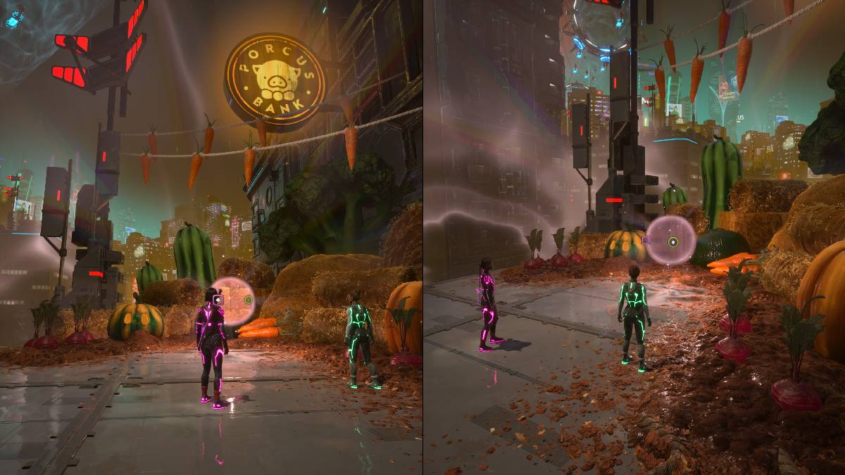 After the boss fight with Ms Hammer and a chase during the Streets of Neon mission, you will have to use an elevator. Before entering the elevator, look around for bales of straw and vegetables.