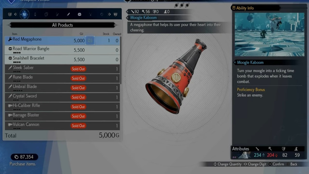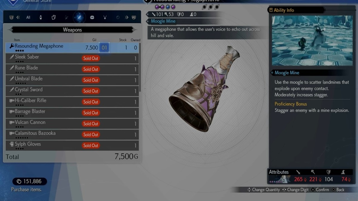 This megaphone will make the moogle scatter landmines on the battlefield. You can get this weapon by purchasing it from a vendor in a General Shop in Nibelheim in Chapter 11.
