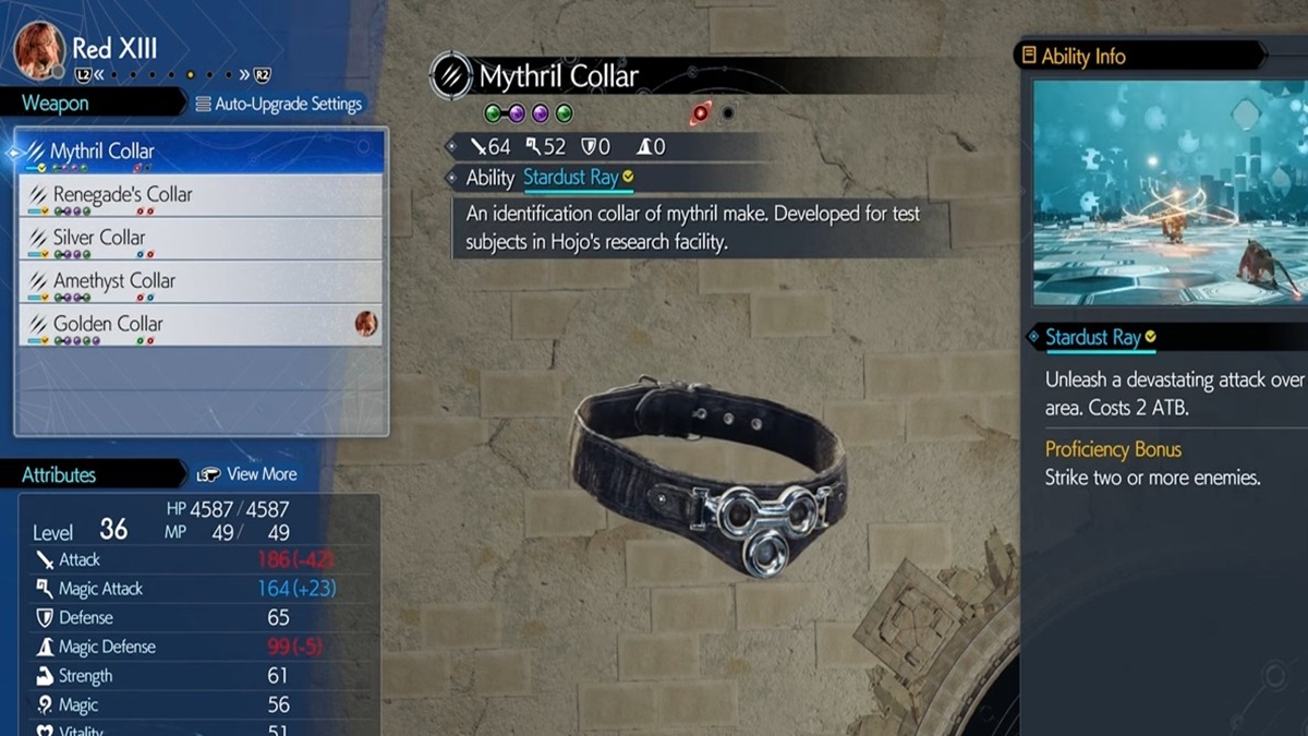 Red XIII uses different collars as weapons in FF7 Rebirth. Same as other weapons in the game, each weapon will provide a different ability and there is a total of 7 collars including the default one that you get from the start of Chapter 2 for Red XIII as well.