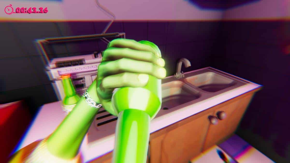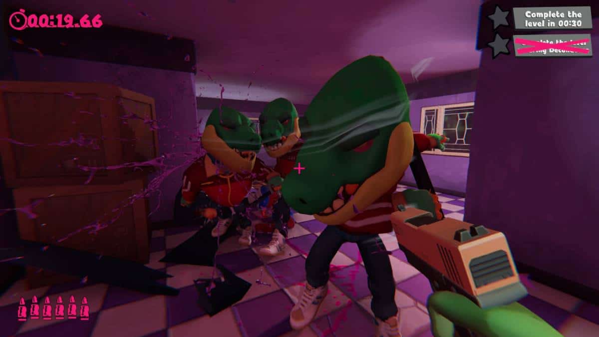 Regardless of their looks, they all have the same objective of shooting you down and then dancing over your body if they succeed. To add to the absurdity, these same enemies go down in a single kick or shot from any gun with classic ragdoll physics. As you progress through levels, you’ll start building up piles of bodies and maneuvering through the chaos like a pro; well, mainly due to everyone’s lack of brain cells more than because of your talented moves. Why would someone with a bomb for a head try attacking you in a cramped apartment kitchen?
