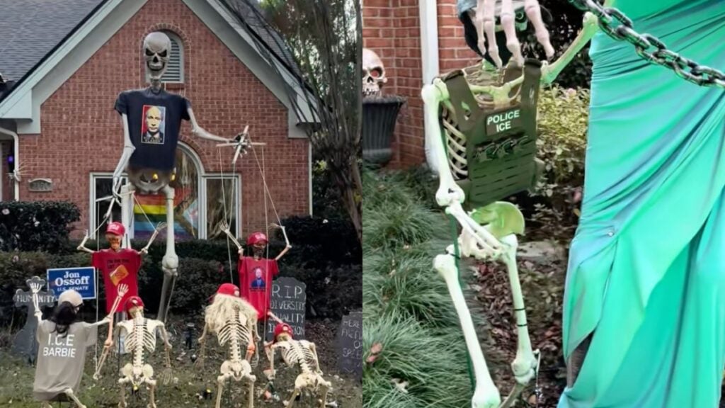 The cherry on top of the bold lawn display is the skeleton on the roof. It looks down on the scene, holding a sign that reads: “We the People, No Kings in America.” The Halloween decorations have garnered tons of praise and support from viewers. “This is SO good. Amazing, no notes!” One TikTok follower comments. “Now that’s a real-life horror story. Sad to think we’re actually living it. I do love that you were brave enough to do this,” another writes. One user echoed the scene’s vibe, saying, “Nothing scarier than reality in the U.S.”