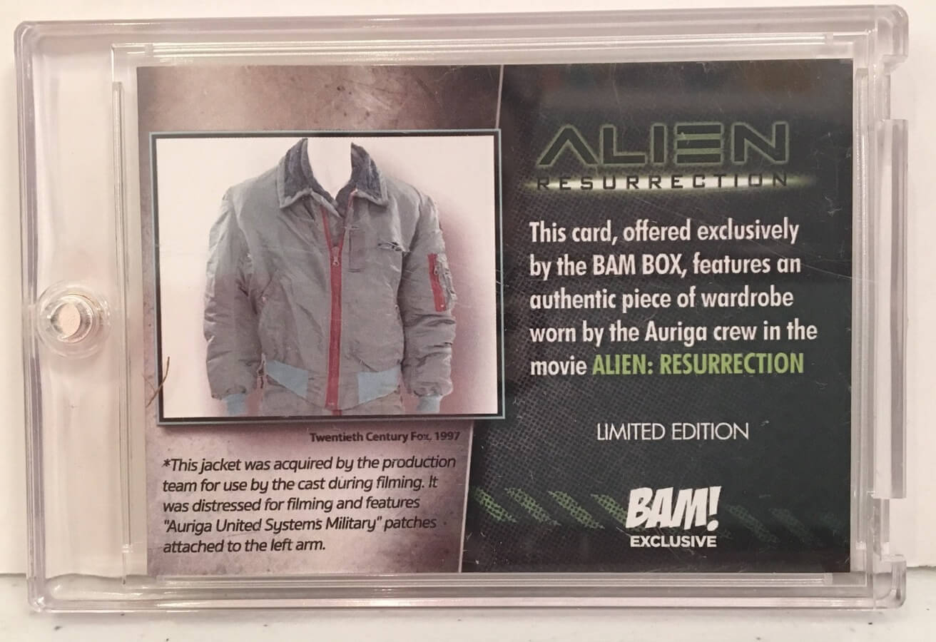 Authentic Wardrobe Card from the movie, Alien: Resurrection – This is another BAM! Exclusive item that is fun and exciting. An actual piece from a movie costume worn by the Auriga Crew.