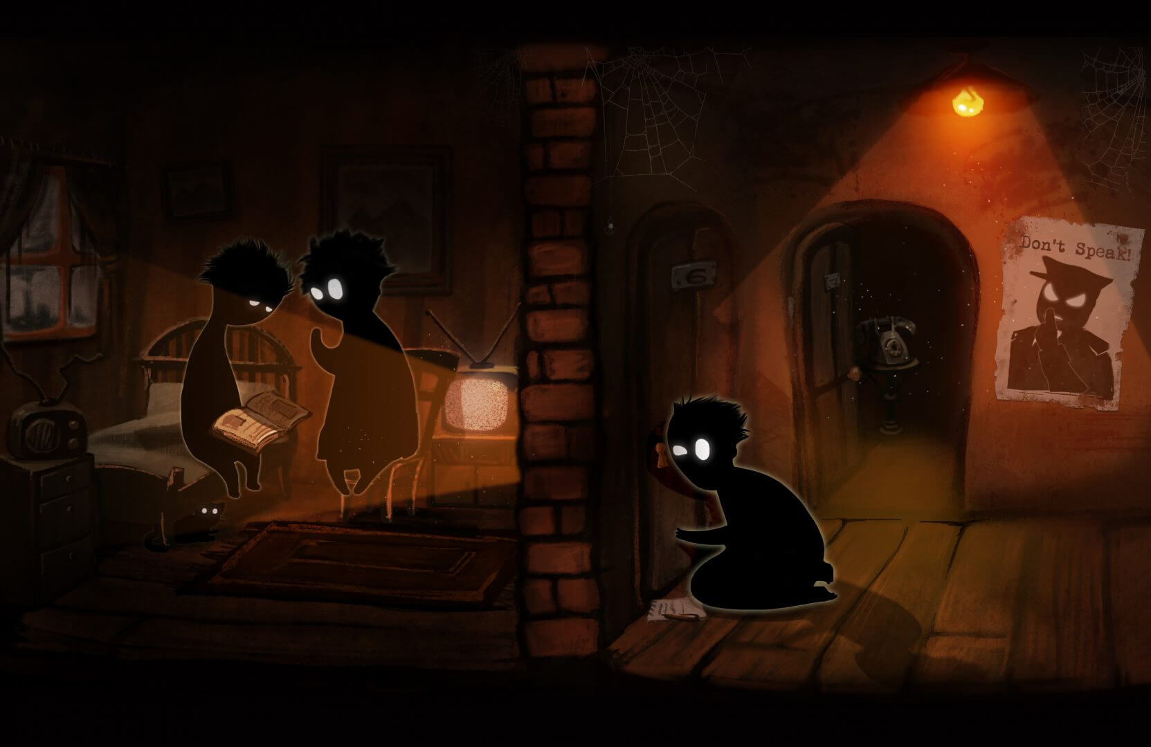 The art style ofย Beholder is also fascinating. The apartments themselves look fairly realistic, but each character is merely a cartoonish black blob with a few bright white features to help distinguish one from the other. Carl wears a tie. The old man in apartment 1 has a beard. In one way, the highlighted features help to bring the characters to life a little better. In another way, the indistinguishable features help to dehumanize the characters a bit; you won’t feel so bad when the police club them on the way out the door for a crime they did not actually commit.