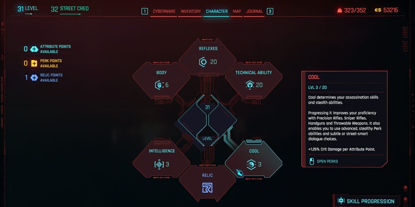 What makes the best assassin build so fun is its incredible versatility. Cool Attribute tree Perks buff Precision Rifles, Sniper Rifles, Handguns, and Throwable Weapons, so you can swap between radically different weapons without impacting your lethality. As the name implies, the assassin benefits from taking a stealthy approach, but if you get sick of sneaking around, this build packs enough DPS potential to kill enemies outright. Though Cool is priority number one, this build also features high Intelligence so that you can hack your way into buildings and out of gunfights. Disable the cameras, silence your enemies, and disappear like a ghost.