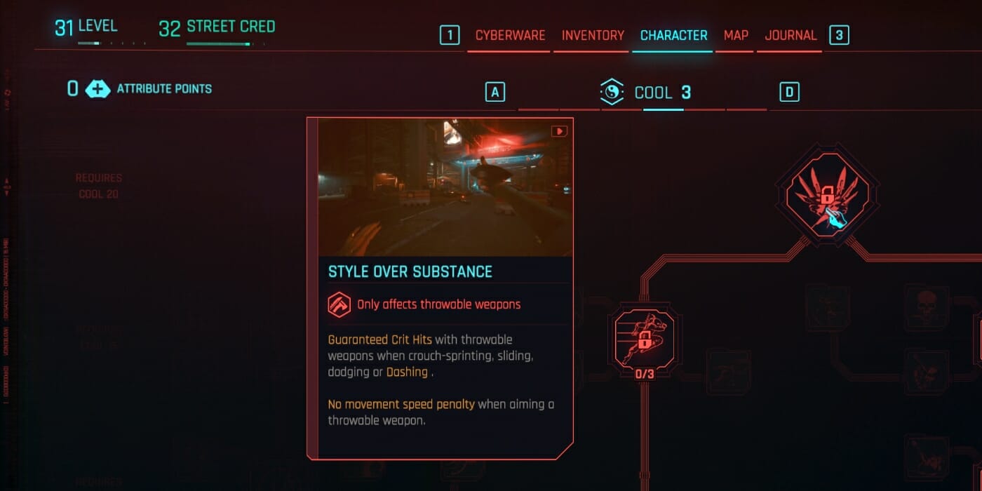 Cool Perks form the bedrock of the best assassin build, so the sooner you can start investing points in Cool, the better. This build takes advantage of the full diversity of the Cool perk tree. If you decide you dislike Handguns, Sniper Rifles, or Throwable Weapons, however, you can respec at any time. As is true of the other perk trees, the best offerings are at the top, which is a further incentive to invest heavily in Cool early on and reap the rewards as fast as possible. Once you’ve grabbed everything from the Cool tree that you want, start taking perks from Intelligence and Reflexes. Alternatively, build Cool and Intelligence simultaneously for more of a cyber ninja feel. The most important Cool perks to take are the following: