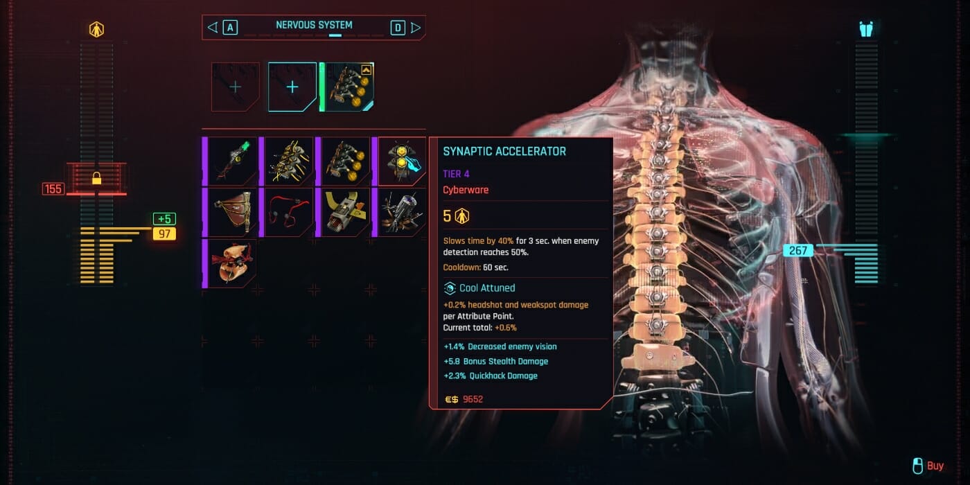 Arguably, the best cyberware for this 2.0 assassin build is the Synaptic Accelerator. A Tier 4 Synaptic Accelerator slows time by 40% for 3 seconds when enemy detection reaches 50%. That gives you plenty of time to silence the enemy before they get a chance to alert their companions. Alternatively, it gives you a chance to dart back into the shadows and reposition. In addition to slowing type, the Synaptic Accelerator offers the following benefits: