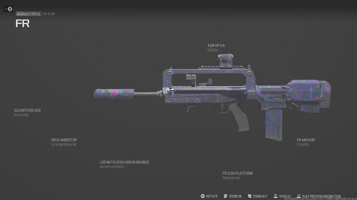 So first things first, pick the 5.56 Nato High Grain Rounds. Then, you’ll need precision to land your shots on target. For that, let’s pick the Silentfire XG6, allowing for recoil control and silent shots that are undetectable under the enemy’s radar. Now, let’s focus on the mobility stats of your weapon, and fix the ADS speed. The DR-6 Handstop underbarrel and FT Anchor rear grip are the best options in this manner, offering the least penalty on recoil. In the end, an Aim OP-V4 works the best if you’re not comfortable with FR 5.56 iron sights in this loadout in MW3. If not, go for a larger magazine size.