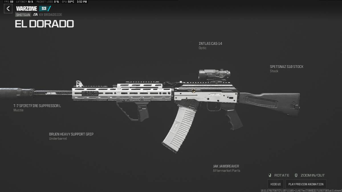 For more accuracy and range, you can have the VT-7 Spiritfire Suppressor L, which masks your shots with KV’s silenced roar. Last but not least, attach a good optic on your KV Broadside JAK Jawbreaker loadout for the best precision sight inย Warzoneย Season 3. You could go for any optic you want, but we’ve tested it, and the Intlas Cas-14 has proven to be a solid choice that offers bonus accuracy points.