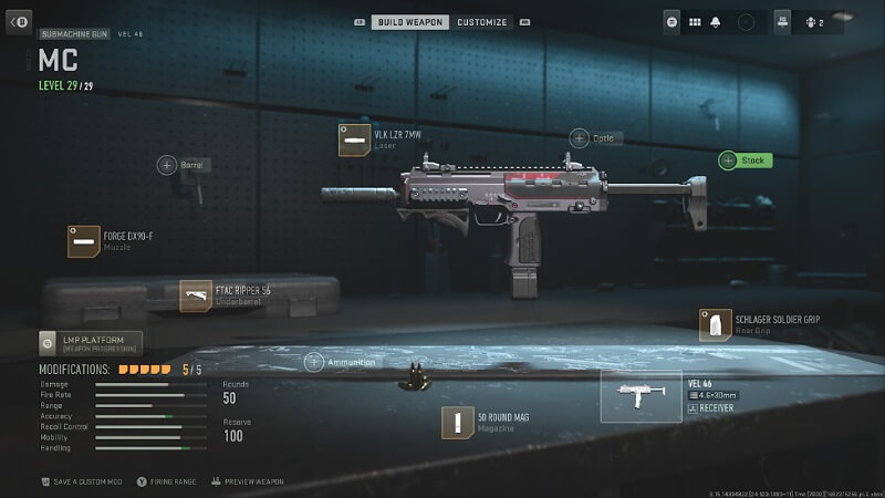 For this Vel 44 setup, we use the VLK LZR laser and Schalger grip to increase the ADS time. Then we can have the Forge DX90-F to maintain the recoil control and increase some damage range. It’s not suggested to use barrels attachment on Vel 44 as it won’t be needed at all. Instead, go for an FTAC Ripper underbarrel to increase accuracy, and add a 50-round magazine to get the best out of this weapon.