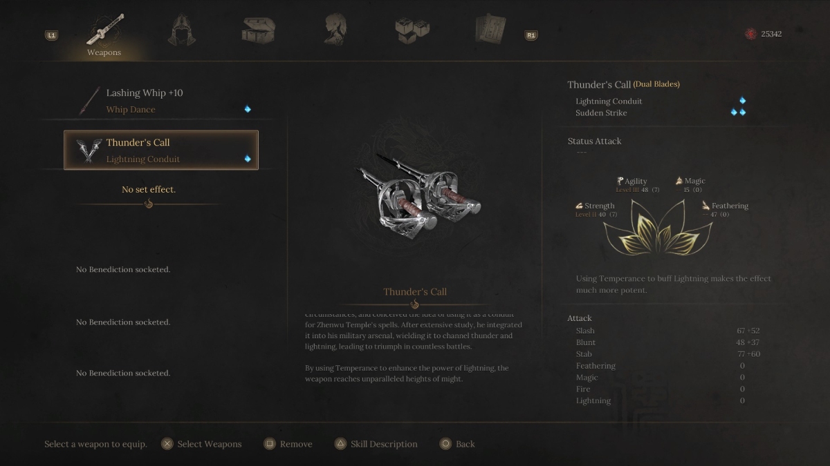 While it isn’t one I’d use for my build, it is definitely worth it for those who like Dual Blades. Thunder’s Call, which you’ll obtain after beating the South General, Liu Wenxiu, comes with an excellent skill. By pressing L1/LB, you can imbue your blades with Lightning to cause fast damage. The reason why that is such a great skill is that it is great against human enemies, especially those wearing metal armor. Furthermore, its cast time is quite fast, making it excellent for getting a few hits in during an enemy’s combo and even building up some Lightning status effect.