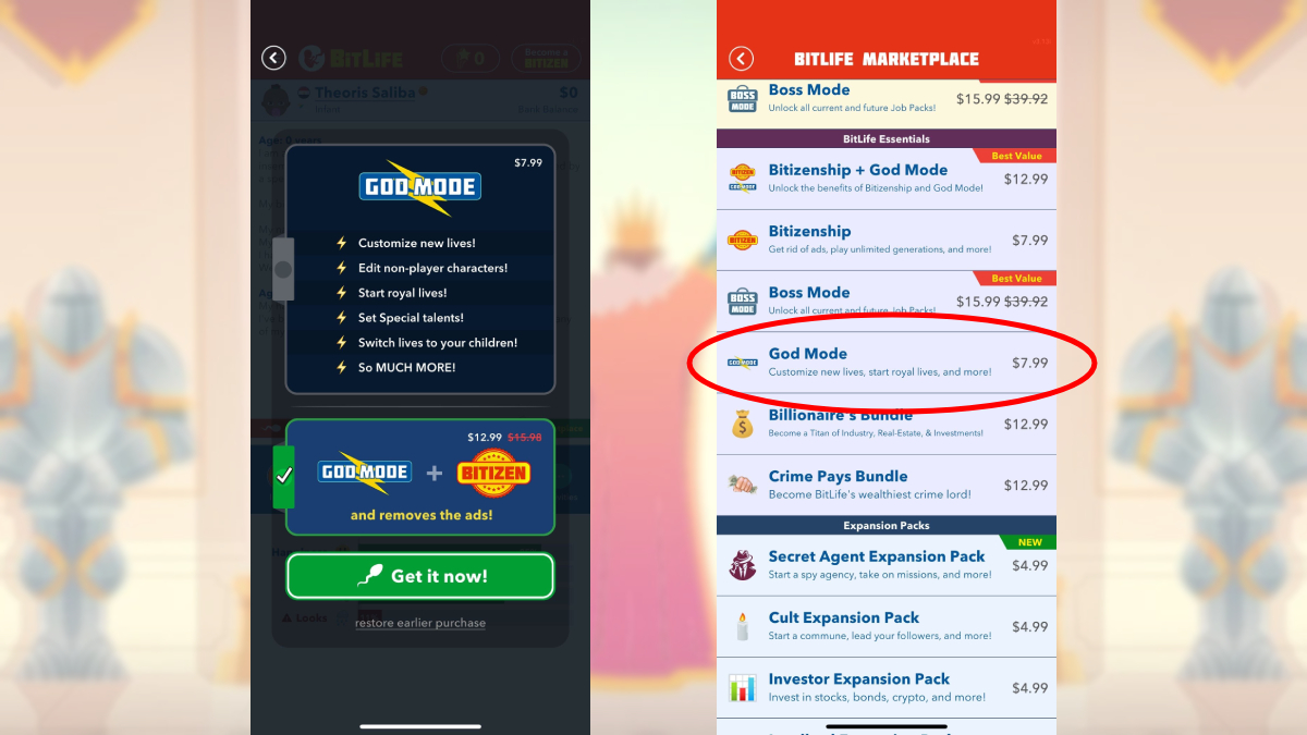 The easiest of all of the above ways to become nobility in BitLife is to use God Mode. This mode will cost you real-life currency, but it’s worth it. It’ll cost you $7.99 in the BitLife Marketplace, under the BitLife Essentials. You can also select to purchase it whenever you make a new life under the Select your special talent, Select your appearance, and Select your attributes selections.
