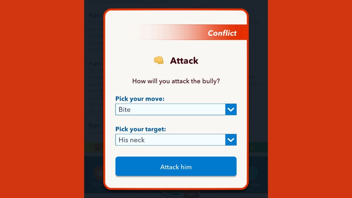You can start biting people from the moment you start school in BitLife. Any time you get into a physical argument, you can choose how you hit the other person. At times, you can choose to bite people. However, if your character’s bite misses, then it doesn’t count.