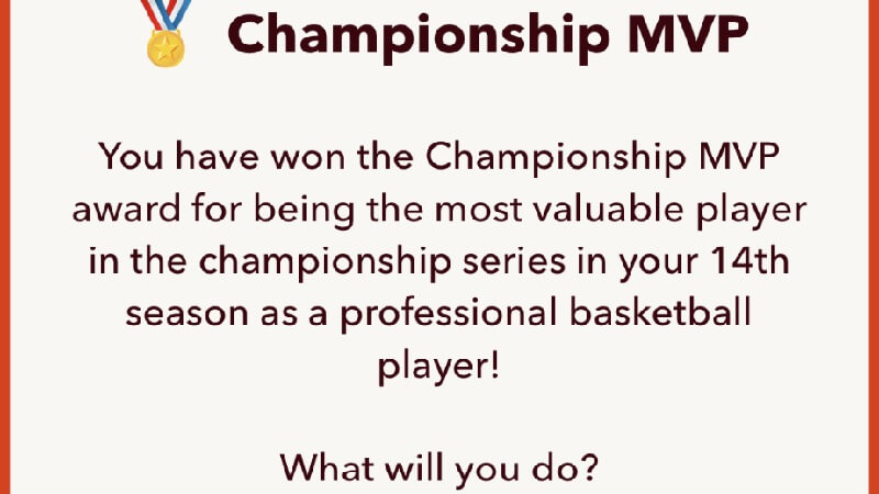 Once you join a professional basketball team, you will need to continue honing your athletic skills and greatness. Every time you age up, a prompt for the end of the season will appear. It will show you how well your team performed that year. Furthermore, if your performance is high and your greatness bar is over 90% filled, you have a chance of receiving an MVP award. You can view the greatness stat under the professional athlete tab in the occupation section.