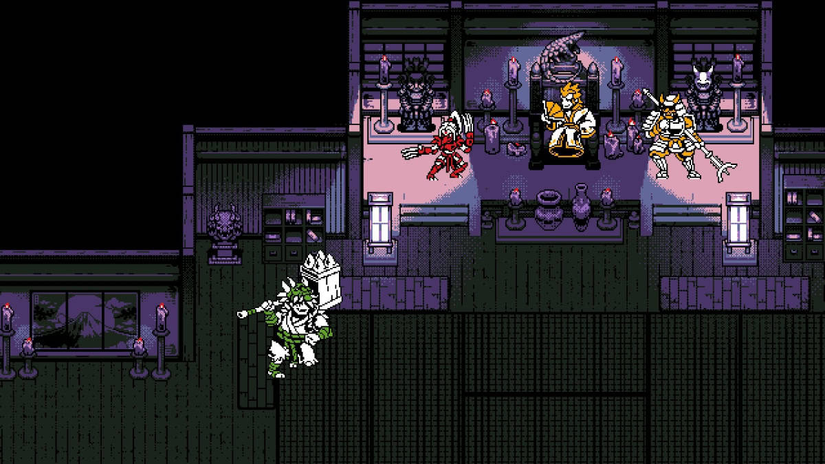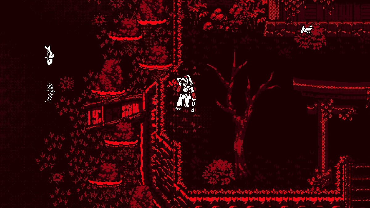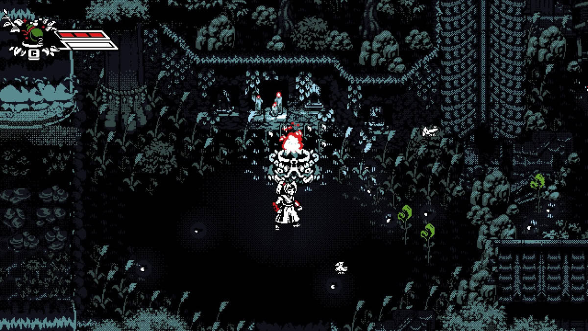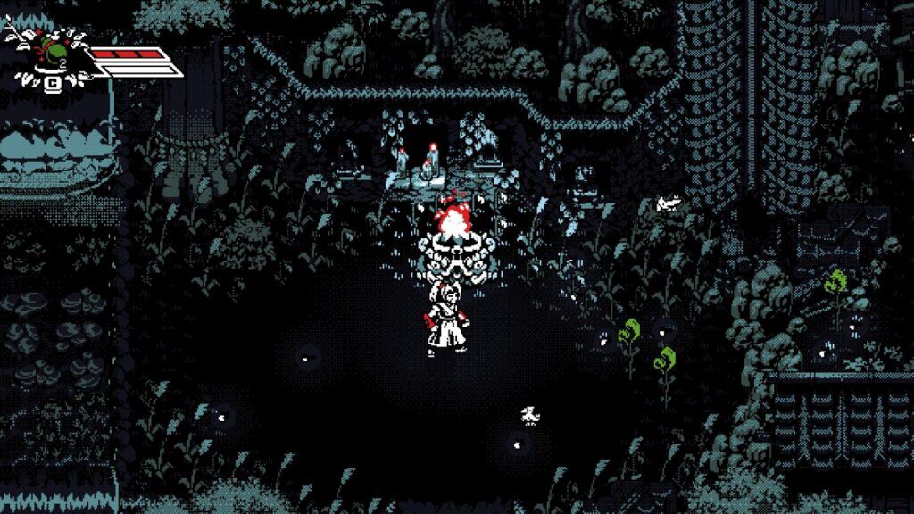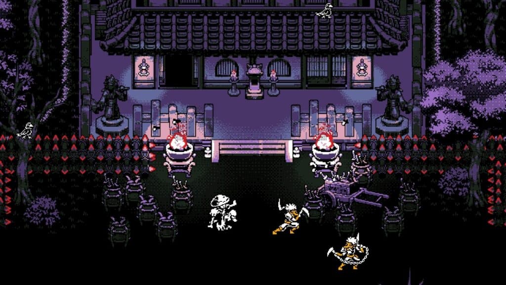 The retro style immediately made me think of arcade titles or Undertale, especially with the color choices. This is because of the completely black background color with color accents to delimit the scenes and characters. Also, despite having an old-school 8-bit style, the effects and animations are pretty fluid and give it style. The exploration is simple as the island is divided by zones as you advance and unlock some shrines. But be careful because traps and ninjas lurk in the bamboo forests, bandits near the camps, and samurai guard essential buildings.