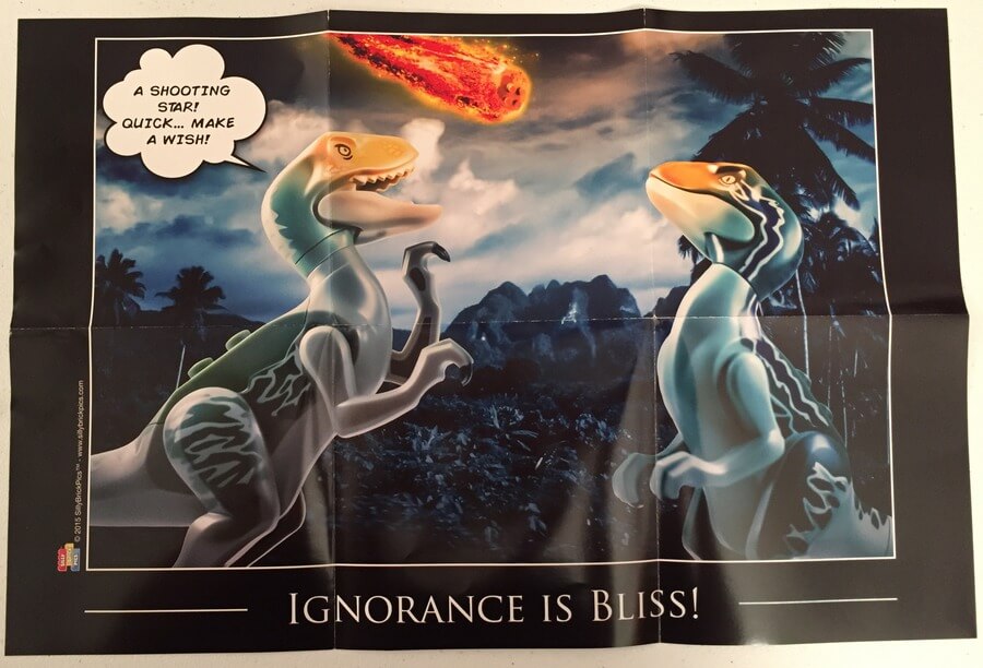 As promised a few days ago in our March BrickSwag review, we went from Cowboys to Dinosaurs with the Brick Builders Club.  We are finding with these boxes, they are somewhat predictable as to the items you get.  Most boxes include a t-shirt, a small brick building project, trading cards, a poster, and some other cool item to go along with that month’s theme.  So, let’s take a look.