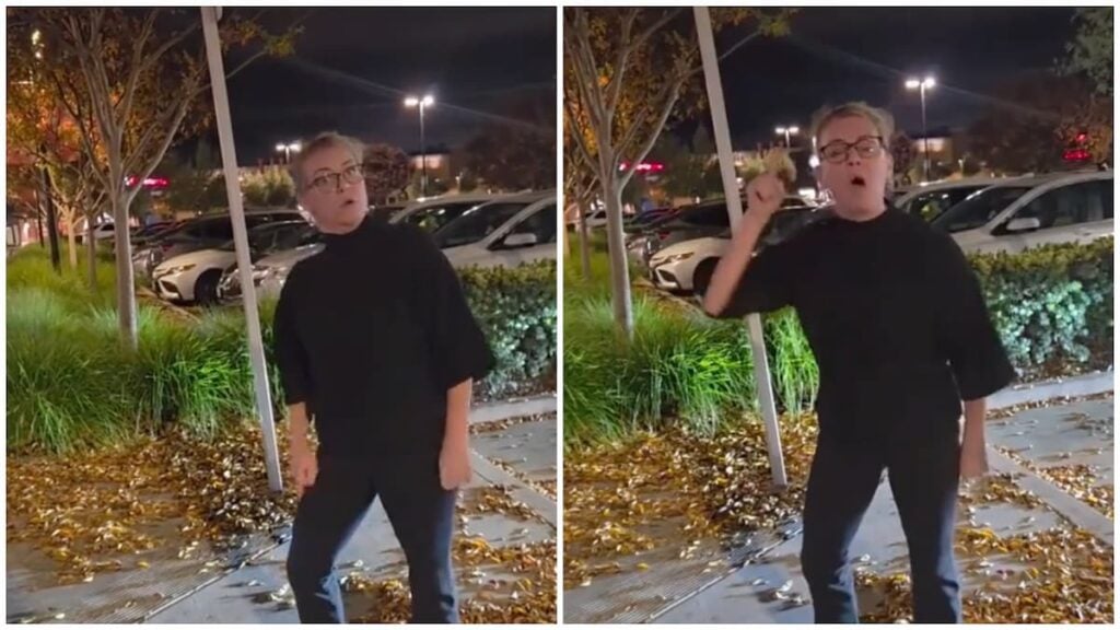 The video opens in a parking lot at night, and sees the Karen in question, sporting a black top and black pants, angrily confronting the couple who are recording the incident. “You’re harassing the [expletive] out of me!” yells the woman, though the person recording calmly replies, “I didn’t harass you. I told you not to hit my car.” The woman continues to loudly shout, “My daughter opened the car door. How hard can a five-year-old do something to your car? Do you think it’s okay for him to speak to me like this when I’m on my own with a one-year-old and a five-year-old? It’s not okay!“