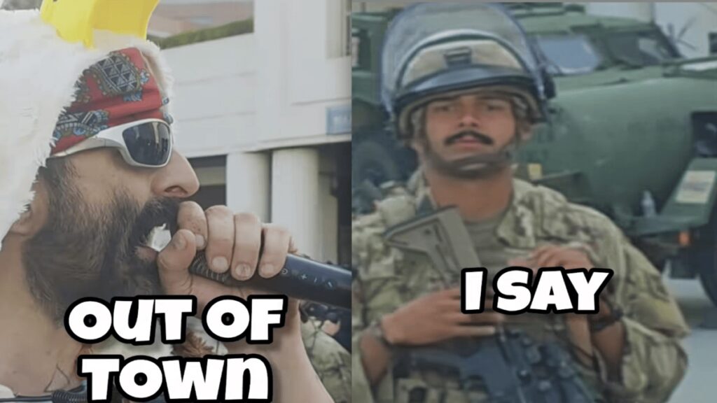 Robby approaches soldiers and ICE agents while singing off-key, “F**k ICE! Get the hell out of town! F**K ICE! Get the hell away from the brown!” As he sings at them with his microphone, they just stand there, looking stoic and trying their best to ignore him.