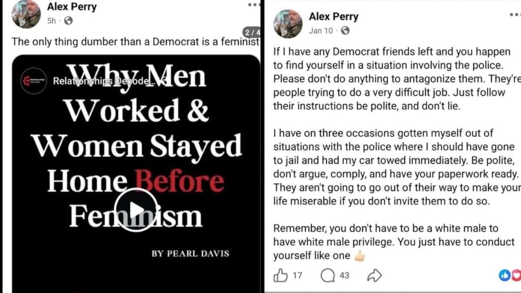 In another post, he shared a video with the caption “White liberal woman attacks and FAFO.” His comment under it read “First video that showed up in my feed today” followed by heart emojis. The final screenshot showed a post he made after the murder of Renee Good by an ICE agent. In that one he advised his Democrat friends not to antagonize the police.