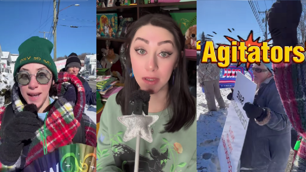 She tells an unseen man, “Don’t talk about my neighbors like that.” He replies that he didn’t care about her neighbors. Her response is, “I know you don’t. That’s the problem.” The Connecticut TikToker shares that the agitators present were “kids with Trump signs.”