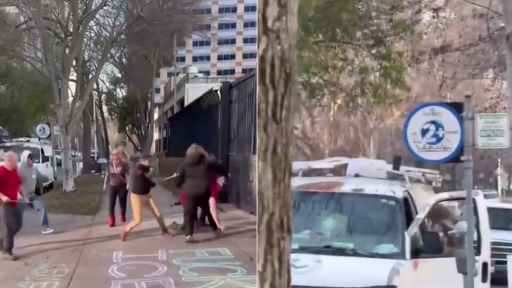 In the video (which you can view here), it’s possible to see an anti-ICE protester being ruthlessly assaulted by seven people. The attackers initially use a baseball bat to strike a white van that belonged to the protester, which had a flag saying “*Expletive* Trump.” When the vehicle’s owner attempts to intervene, the group overwhelms him, punching and striking him with a baseball bat. After knocking the man to the ground, one individual restrains him while shouting, and a woman who appears to be part of the mob sprays him in the face.