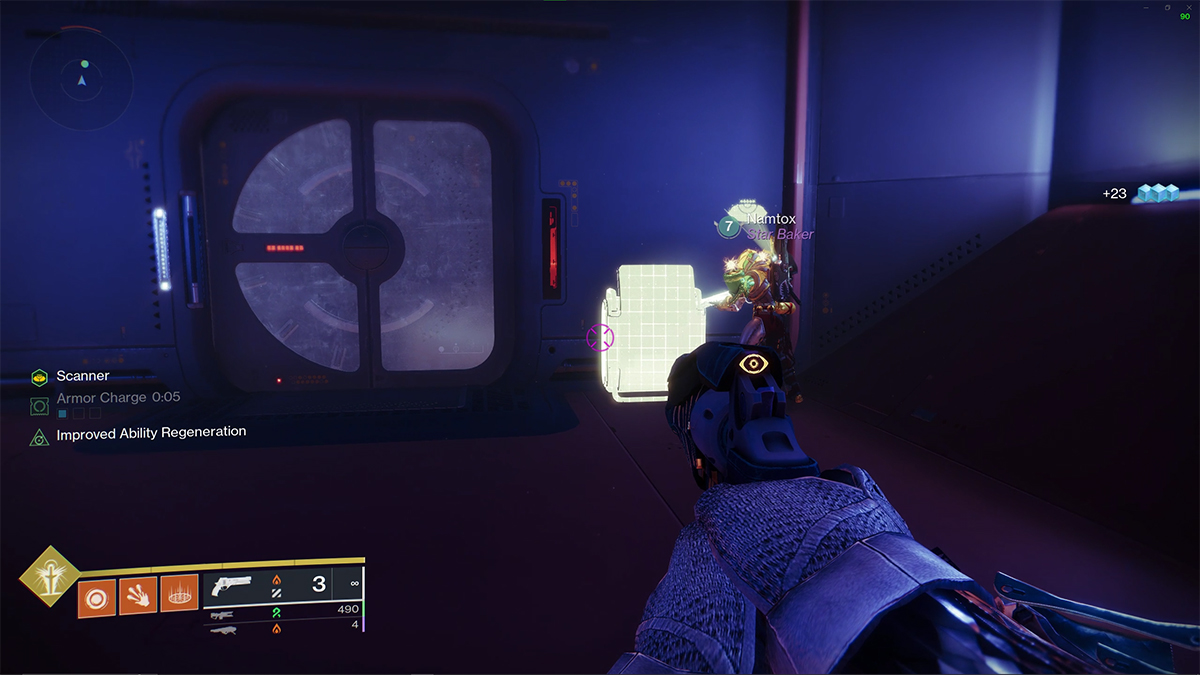 When you enter the next room, you’ll find a few enemies standing around some consoles and messing around with them. Notice that one of the enemies has a glowing yellow symbol over their head. This is the Scanner buff. Take out the enemies one by one and take the Scanner buff that falls from the one enemy.