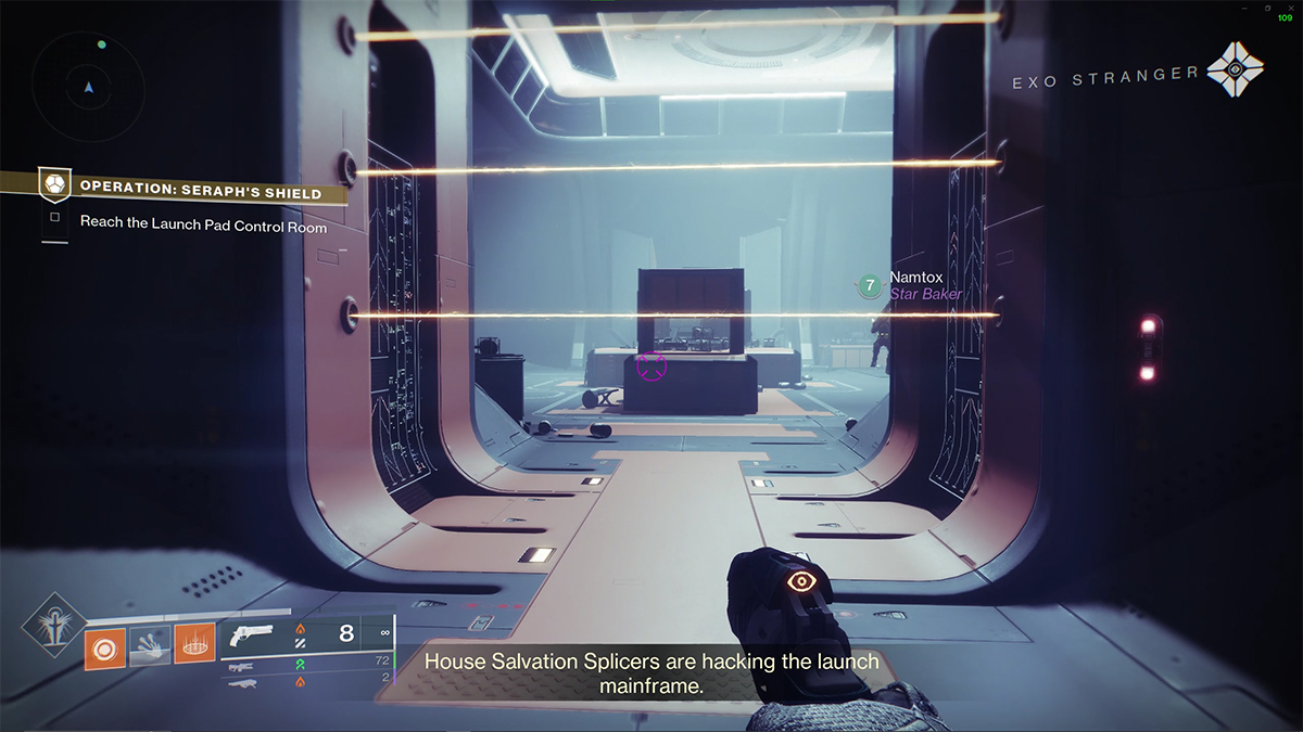 Once you make it inside the Seraph Facility Entrance, you’ll need to follow a couple of hallways, and then pass through your first trap. As you approach the doorway, you’ll probably notice the lasers blocking your path. The first set of lasers is low to the ground and you can jump over them. However, the second set of lasers is much higher up and leaves a small gap at the bottom. Here, you’ll need to crouch in order to pass.