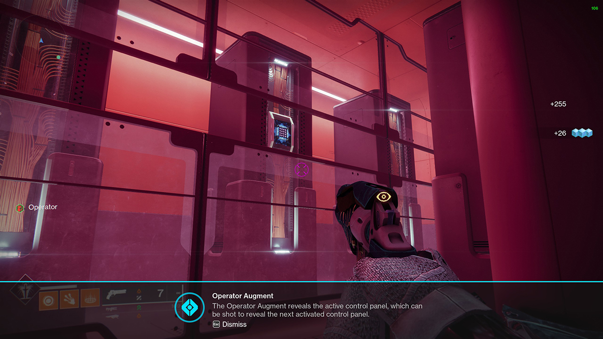 As you head into the next room, you’ll need to pick up a new kind of buff called the Operator Augment. This buff will allow you to shoot panels hidden on the walls in order to activate them.