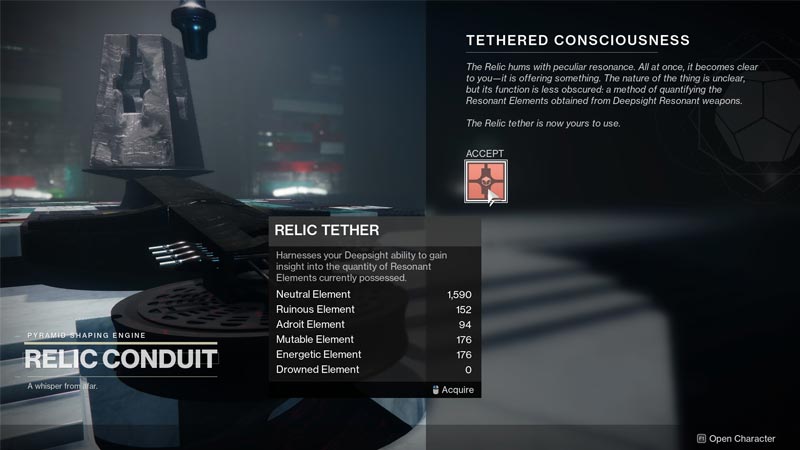 Despite the vague name, Relic Tether is actually a pretty useful item: it lets you quickly keep track of the number of crafting resources (also called Resonant Elements) you have without the need for third-party tools. Relic Tether shows up in the Consumable tab of the Inventory. Simply hover over it to see the full list of Elements and how many of them you possess. You can do this without needing to go into Orbit.