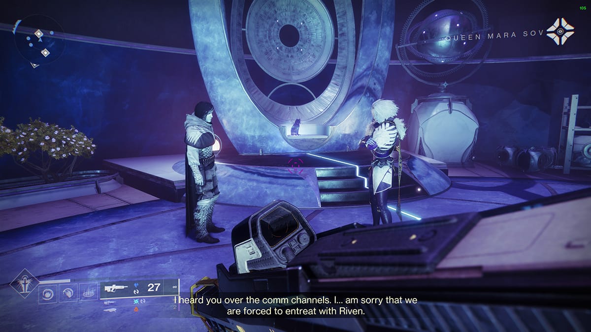Mara Sov will call upon you once the Techeuns have calculated the location of another Ahamkara egg. Until then, continue to defend Riven’s Lair against trespassers.