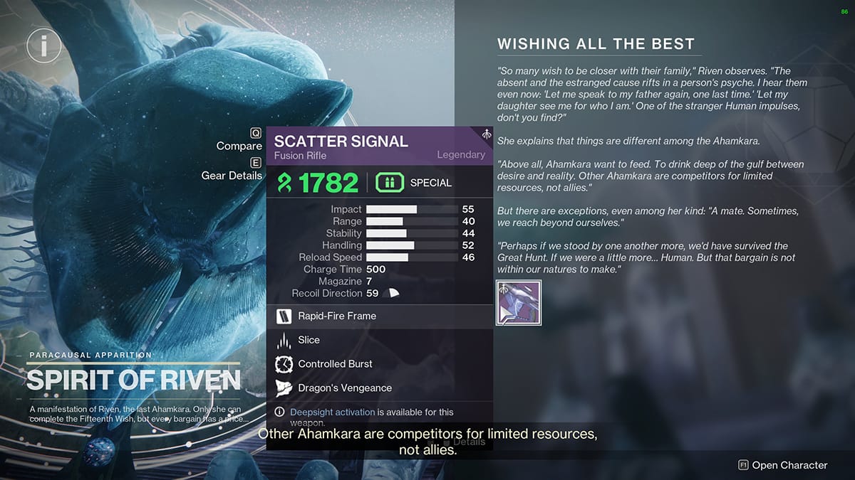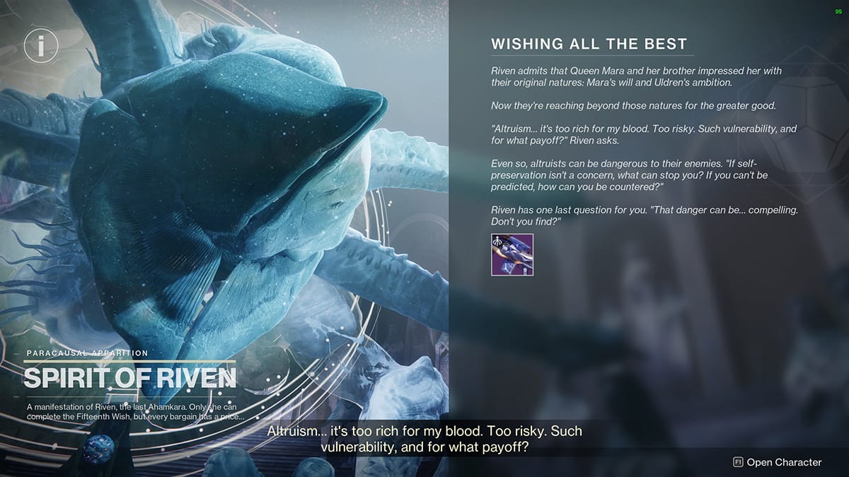 Riven will speak to you with her true voice, a sign of trust. She will tell you that Savathun’s Wish is the last she will grant.