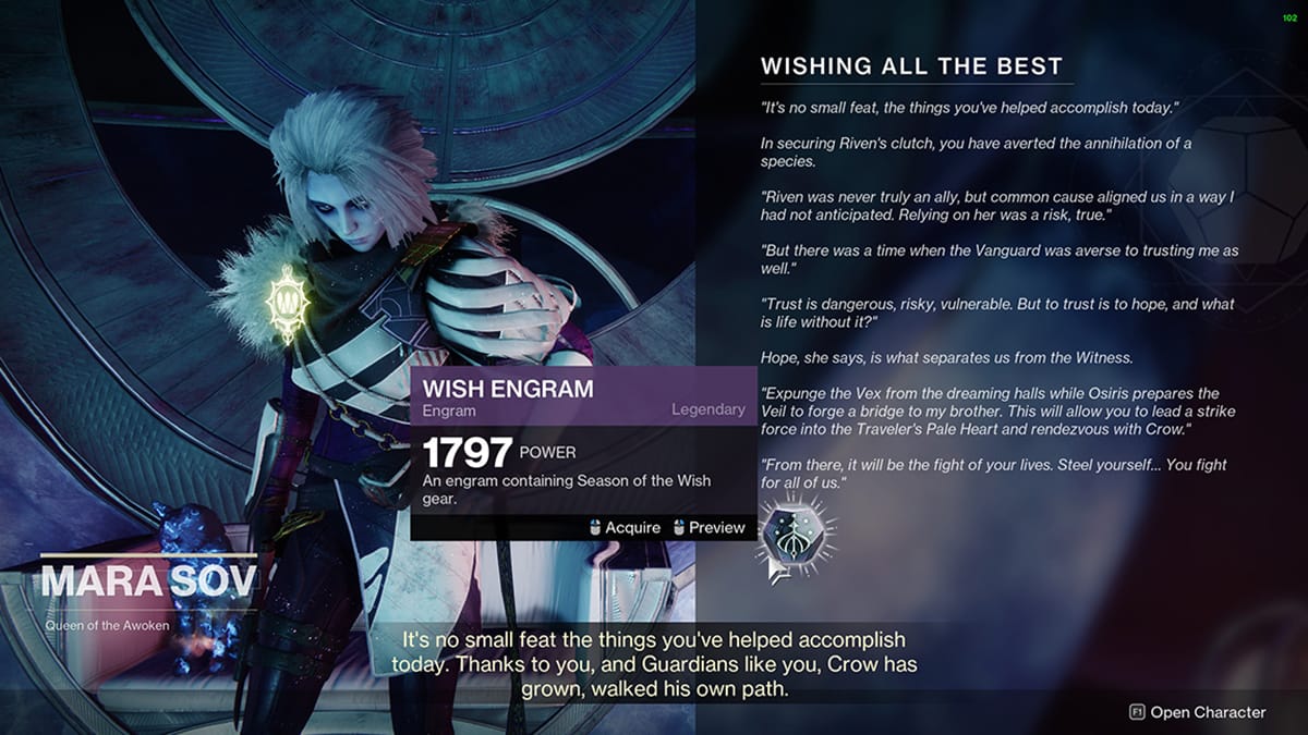 The wish is made, Riven is no more, and Crow has begun his journey into the unknown. Mara Sov wants to speak with you about all that has transpired.