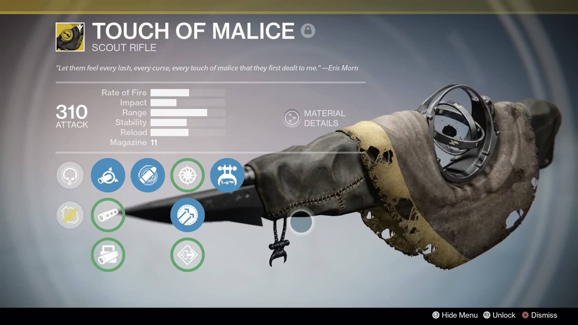 Okay…whose ready to grind!? Don’t all jump at once now… Anyone? No? Okay. Well to get Touch of Malice, Eris is going to need you to obtain 25 Wormspore. 50 weapon parts, and 50 Hadium Flakes. The latter is the most tedious as they can only be obtained in chest throughout the Dreadnaught and only one at a time. I recommend going to the mausoleum section of the ship and running in a big circle, checking each of the hidden rooms for a chest. Most of the time they will respawn by the time you make the loop., but if not go out and reload the area just to be sure. This going to take some time so perhaps putting a movie or some music on will make the grind more bearable.  Return to Eris and give her the needed materials…and maybe a nasty look to.