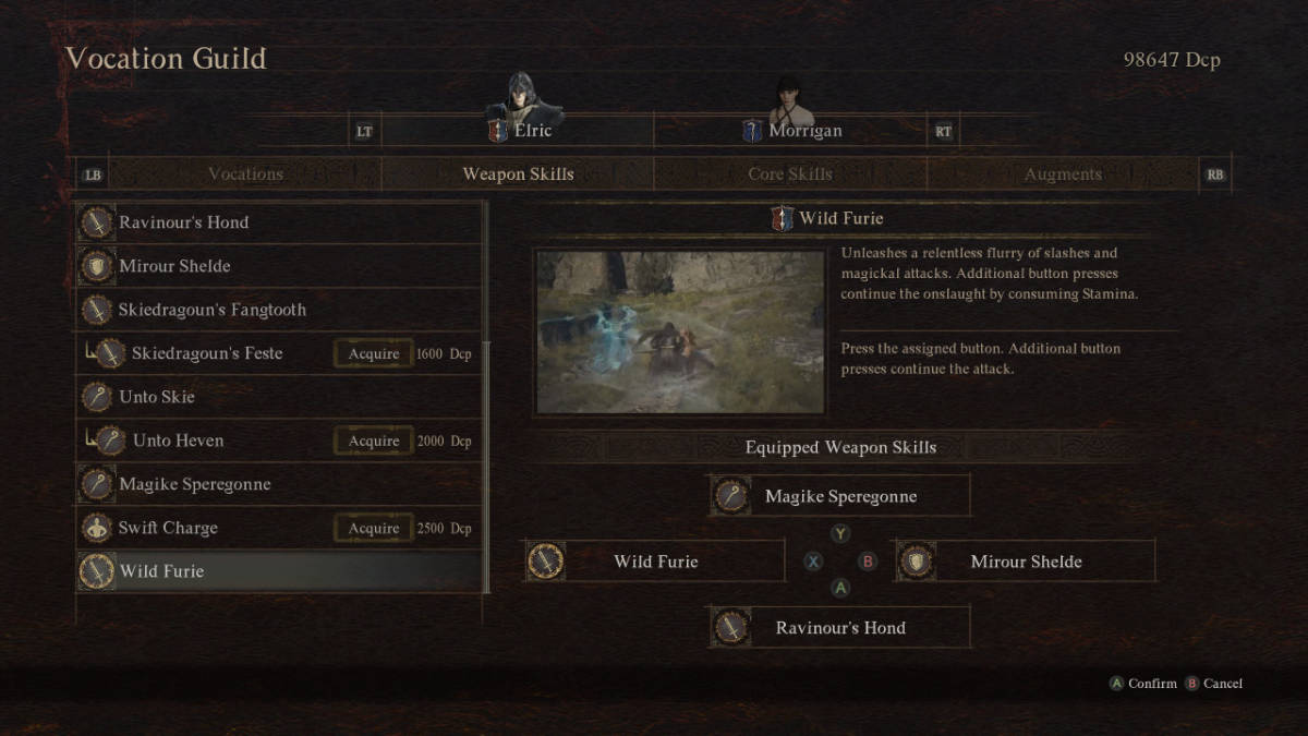 Wild Furie | Unleashes a relentless flurry of slashes and magickal attacks. Additional button presses continue the onslaught by consuming Stamina. |
