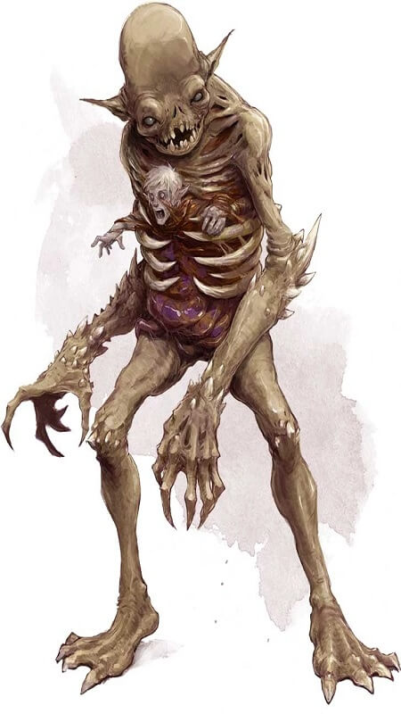 Devourers seek to create more undead. Standing at eight feet tall with a hollowed rib cage, Devourers hunt humanoids to satiate their hunger for souls. When players drop to zero Hit Points, a Devourer can teleport the adventurer inside its own ribcage and torture them with telepathic noise. If Dungeons and Dragons players die in this manner, their characters become a form of undead dependent on how strong they were (a zombie, a ghoul, or a wight). Devourers also can create a necrotic vortex called Soul Rend, dealing 8d10 damage to all creatures within a 40-foot diameter.