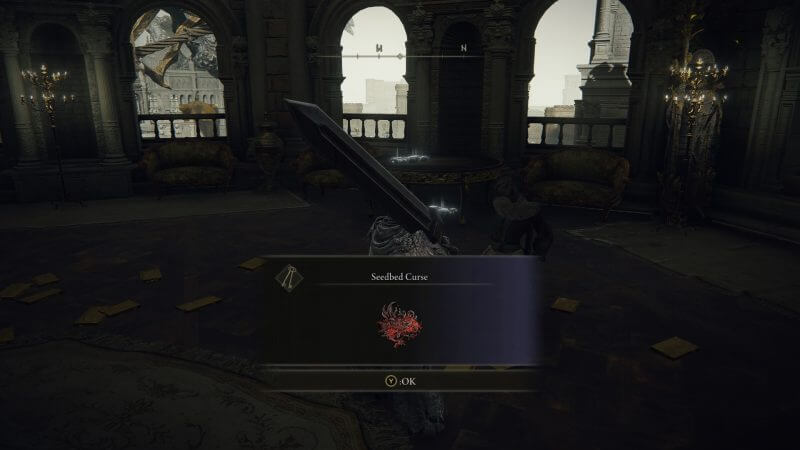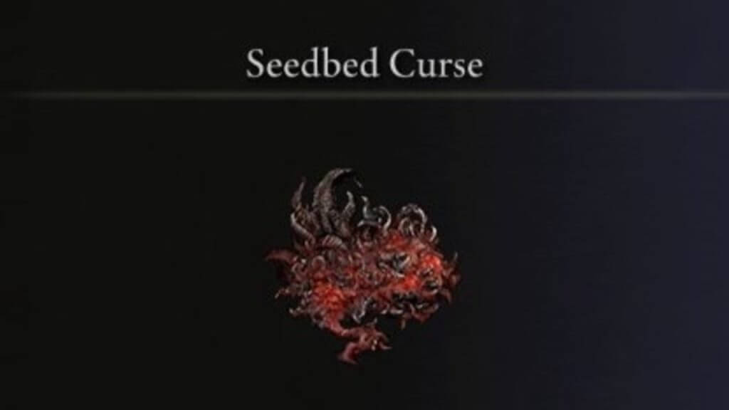 The first of two Haligtree locations the Seedbed Curse can be picked up at starts from the Prayer Room Site of Grace. Go out of the arched doorway to the right of the Site of Grace and follow the straight walkway to the very end after a small flight of steps. You should see a narrow bridge that heads down right over the railing you will want to hop onto. Jump to the platform to the northwest with a gazebo-like structure in the center. Run directly across and hop on the second narrow bridge heading back upwards. After getting to the end of the short bridge on the ridge, walk along the edge to the very end to find the Seedbed Curse on the chair-ridden corpse.