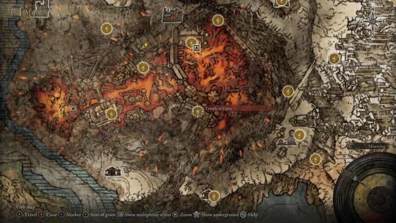 The first Seedbed Curse you can come across is in a secret area you can access at the Volcano Manor area of Mt. Gelmir. You will want to start from the Temple of Eiglay Site of Grace, where you should have fought a Godskin Noble boss. Head to the end of the temple hall and take the short lift up that will be to the right of the altar. Walk out and around the balcony to the opposite side, where you can drop down near a small magma pool infested with Burning Slugs. Keep to the right as you climb up the brief and narrow winding path up to the next area. When you reach the clearing with an enormous magma pool, you will want to keep to the left as you move back towards the keep. Jump through the small window that is visible and accessible from outside, but be careful as a single Abductor Virgin will aggressively attempt to attack you as you make your way inside. Go to the door to the right and follow the fairly linear path ahead past Man-Serpent and Poison Noble enemies.