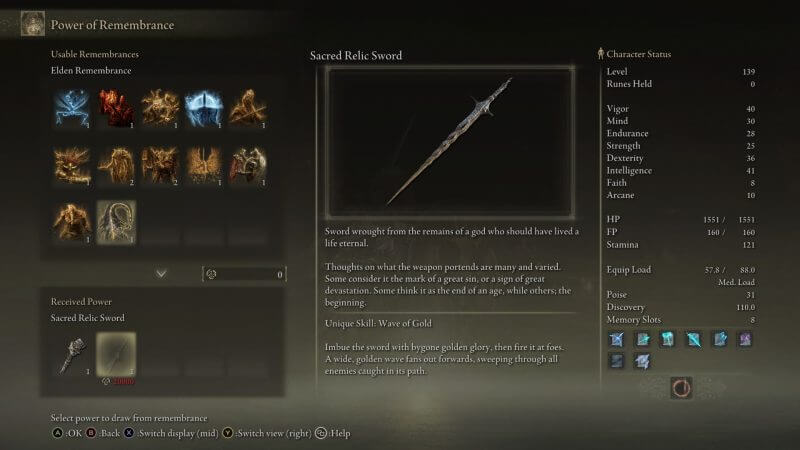 The Sacred Relic Sword is only able to be obtained after beating the main story of Elden Ring and slaying the final bosses Radagon of the Golden Order and the Elden Beast back-to-back. After defeating a significant story boss in Elden Ring, you are rewarded with a key item called a Remembrance. You can take these to the Finger Reader Eina in the Roundtable Hold, where she can exchange each Remembrance for one of two weapons of your choice, such as the Axe of Godrick or the said Sacred Relic Sword. All the Remembrance weapons are tied to the boss you defeat in some way, so it makes sense that defeating the final boss is the ultimate form of Holy power. After the epic duel between you, the lowly Tarnished guided by Grace, and the consecutive godly might of Radagon and the Elden Beast, you will be automatically rewarded the Elden Remembrance.