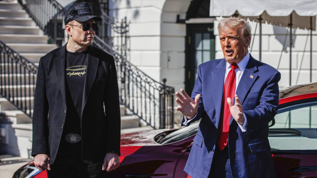 Elon Musk present as Trump views Tesla Vehicles on the South Lawn Driveway of The White House