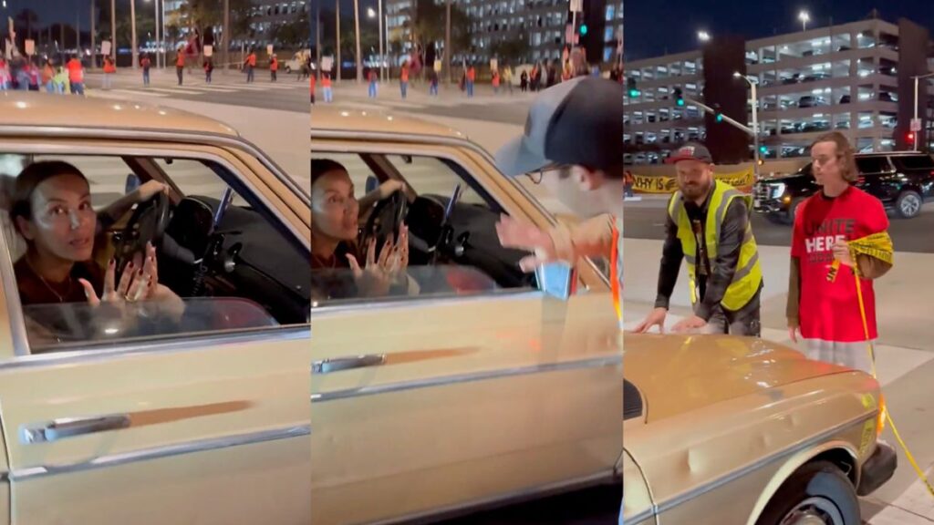 The woman, already tearing up, pleaded, “I’m going to miss my flight. I’m flying to Europe.” Her pleas, however, fell on deaf ears as 3 protesters stood directly in front of the car the woman was in, blocking its path. An earlier clip on X showed the multitude of protesters, mostly wearing red, carrying handmade signs and some using blowhorns. The reporter explained that there were “hundreds of people” at the intersection, who chose to protest on one of the “busiest travel days of the year.” They have since been identified as LAX airline catering workers who made a statement before Thanksgiving.