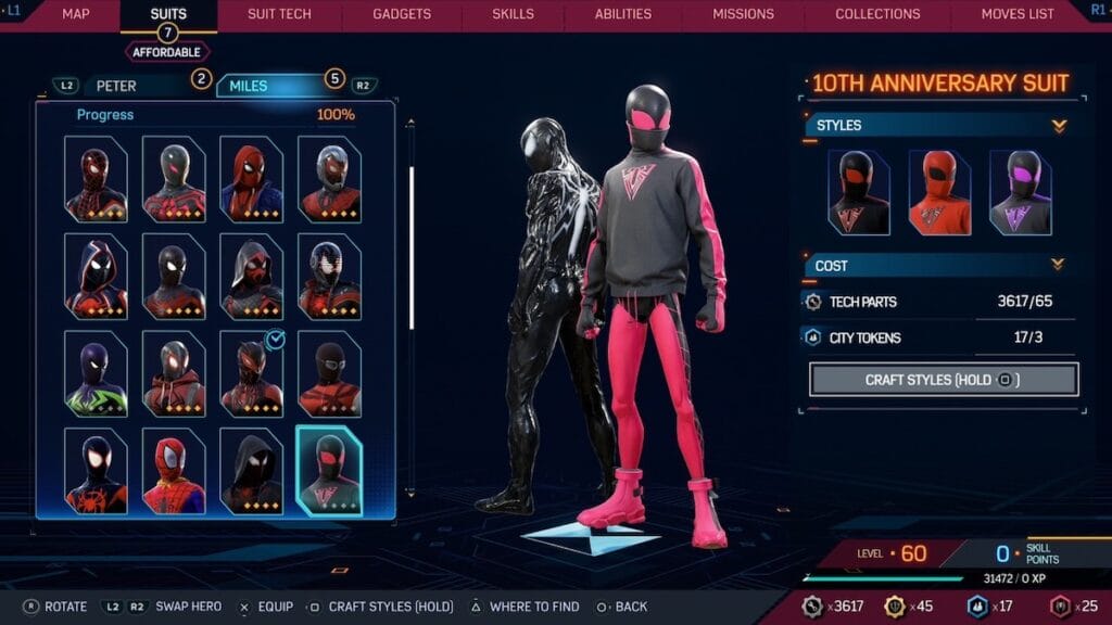 The 10th Anniversary suit is probably one of the most unique looking suits for Miles in Spider-Man 2. It has a pink and black color scheme, that despite not being Miles go to, still feels like it fits him far more than it would fit Peter. It also helps that the pink and black combo just looks so good. The lower half of this suit is nearly perfect, but the top half does have a strange over-sized sweater and a strange spider logo on the chest, but overall, its sleek design is great.